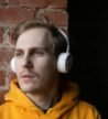 A mobile barbershop set up within a bright yellow truck is parked beside a sidewalk with two young men in vibrant orange uniforms. One man stands outside the truck on the pavement, and the other is inside the truck, which has its side open displaying a barber chair and accessories. There are trees and a building with large windows in the background.